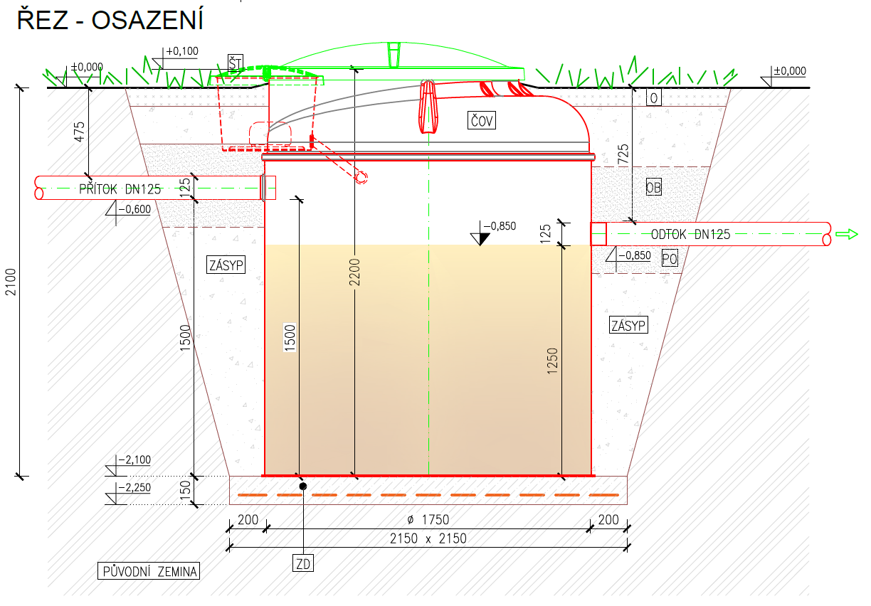 - výška přítoku 1500 mm (pokud je odpadní potrubí ve větší hloubce, lze ČOV vybavit nástavcem v potřebné výšce)