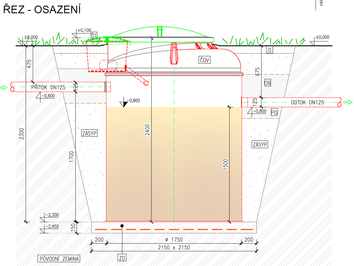 - výška přítoku 1700 mm (pokud je odpadní potrubí ve větší hloubce, lze ČOV vybavit nástavcem v potřebné výšce)