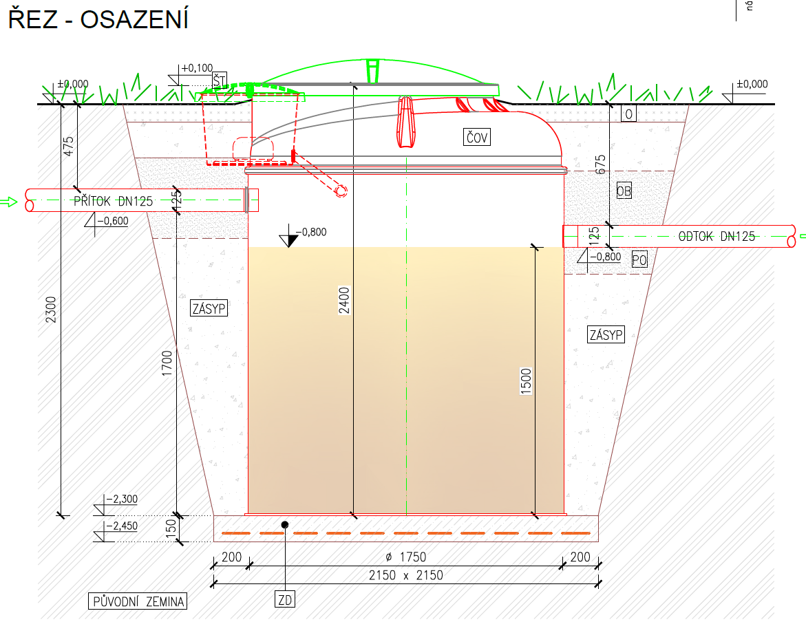 - výška přítoku 1700 mm (pokud je odpadní potrubí ve větší hloubce, lze ČOV vybavit nástavcem v potřebné výšce)
