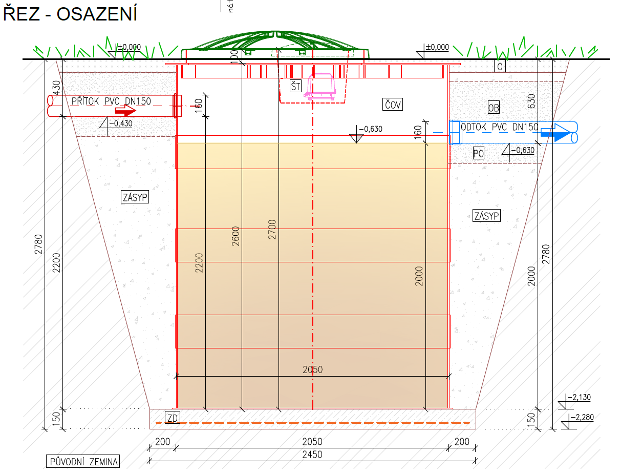 - výška přítoku 2200 mm (pokud je odpadní potrubí ve větší hloubce, lze ČOV vybavit nástavcem v potřebné výšce)
