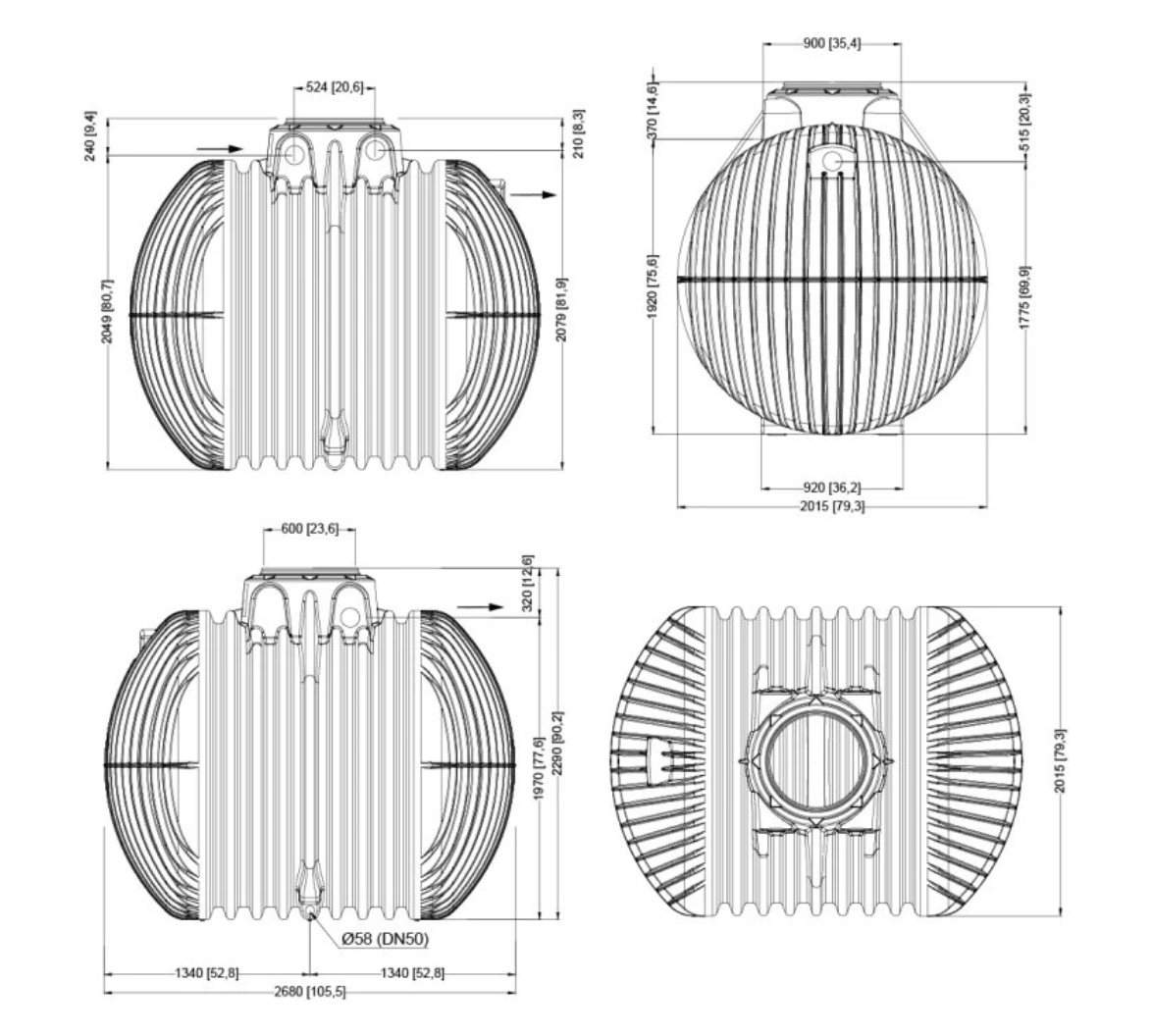 Nádrž je osazena čtyřmy gumovými průchodkami DN 110 v různých výškových úrovních. Nejnižší průchod z čela nádrže se obvykle používá pro bezpečnostní odtok do vsaku nebo kanalizace. Vyšší otvory slouží k napojení nátokových potrubí a pro průchod vedení od čerpadla, kabelů atd.