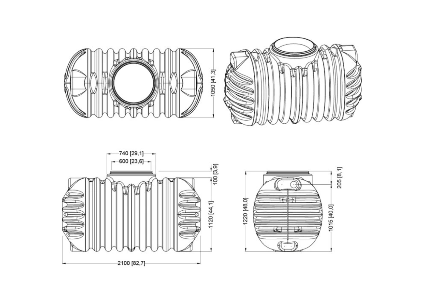 Nádrž je osazena gumovou průchodkou DN110 otvor DN110 v revizním komínku jsou osazeny další tři gumové průchodky DN110