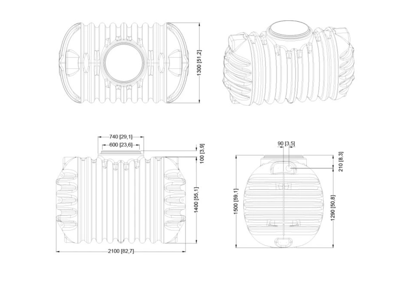 Nádrž je osazena gumovou průchodkou DN110 otvor DN110 v revizním komínku jsou osazeny další tři gumové průchodky DN110