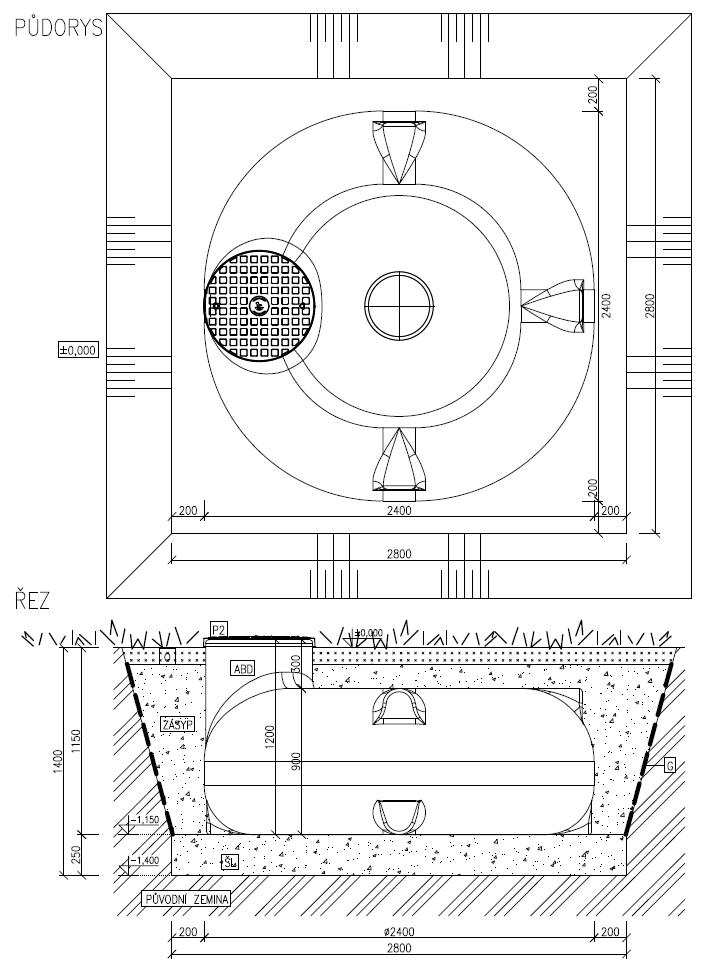 - nátok a gumový prostup pro odtok z nádrže DN 125