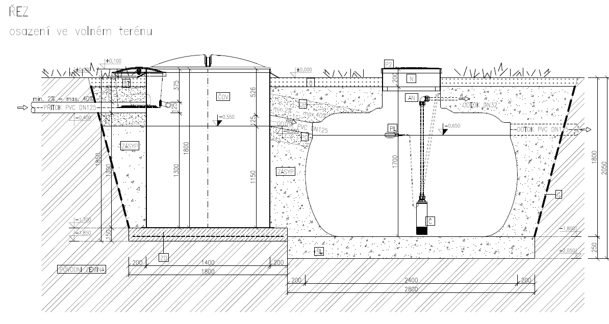 - výška přítoku 1300 mm (pokud je odpadní potrubí ve větší hloubce, lze ČOV vybavit nástavcem v potřebné výšce)