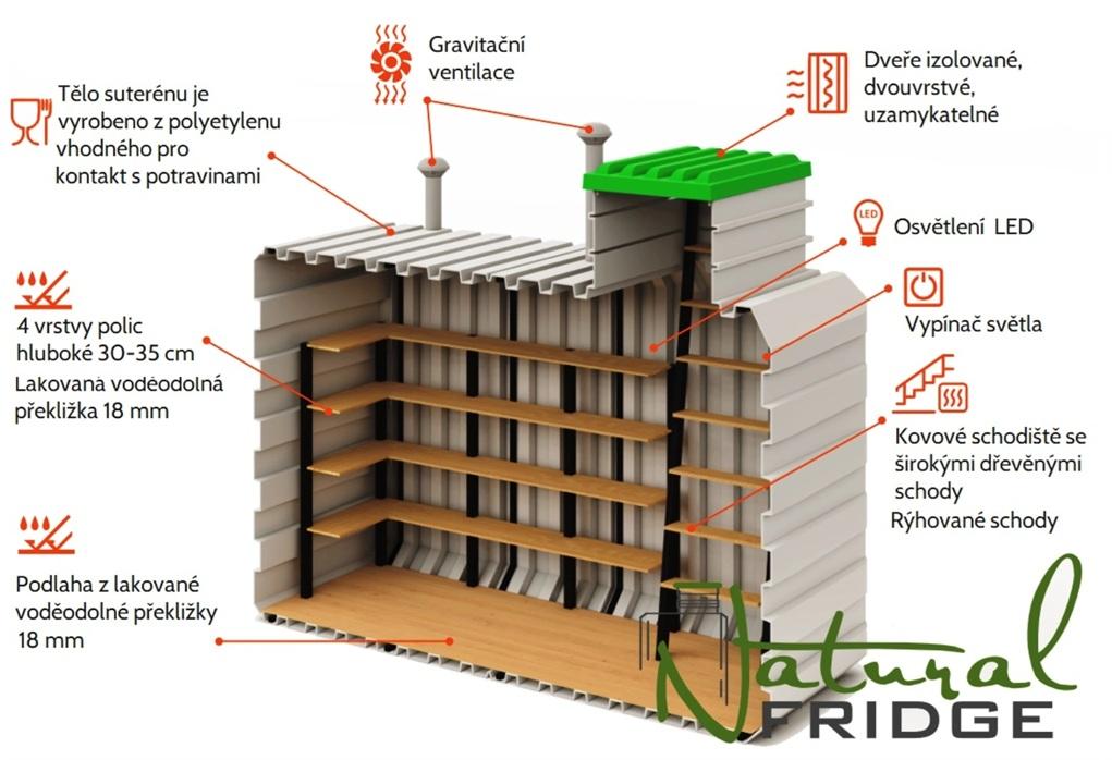 Zemní sklep udržuje optimální teplotu, je tak ideální pro skladování zeleniny, ovoce, domácích džemů, alkoholu a ostatních trvanlivých potravin.